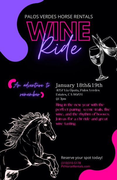 Savor the journey: one sip and one gallop at a time. Enjoy an exquisite 1hr trail ride through Palos Verdes Estates and enjoy delicious wine in Earnie Howlett park