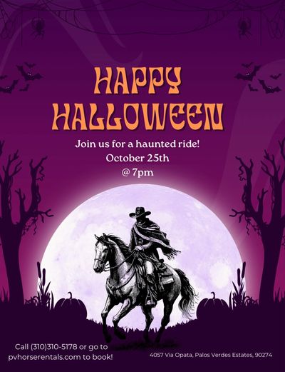 Adventure out on a moonlight ride through the Misty Hills where the crunch of Hobbs meets the rest of autumn leaves. Feel the thrill of Halloween on horseback ——if you dare to follow the trail beyond the pumpkins into the shadows….